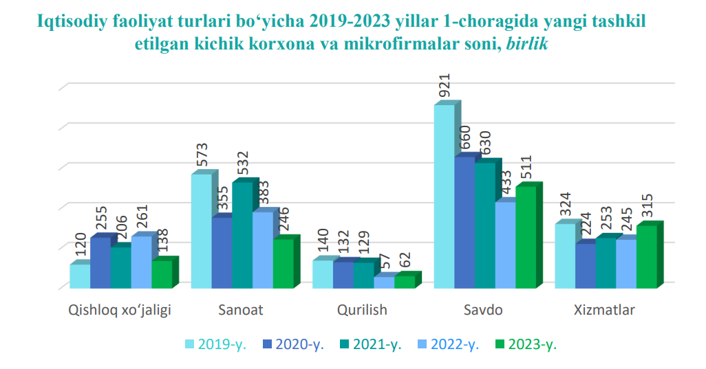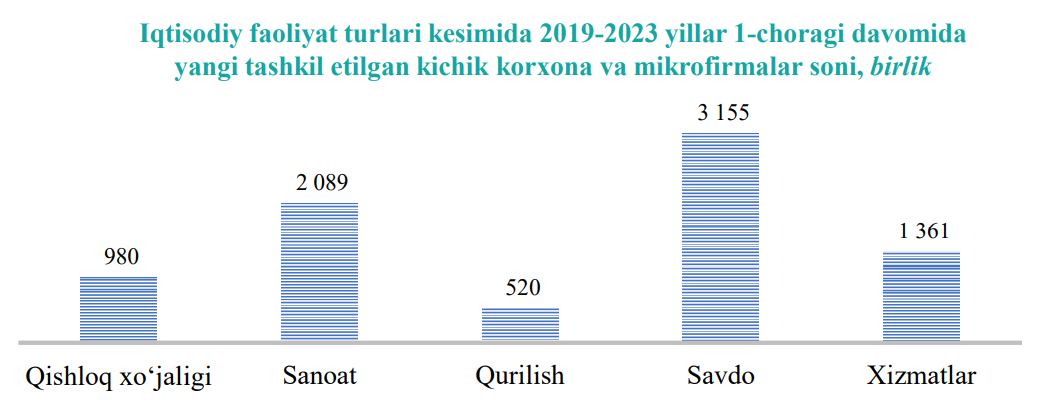 Respublikamizda 2023-yilning yanvar-aprel oyida yangi tashkil etilgan kichik tadbirkorlik subyektlari soni 30 196 tani (fermer va dehqon xo‘jaliklarisiz) tashkil etgan bo‘lib,