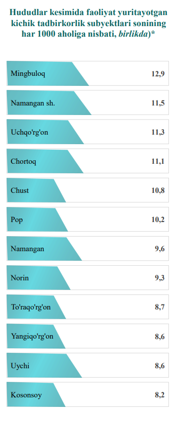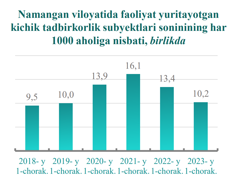 Namangan viloyatida faoliyat yuritayotgan kichik tadbirkorlik subyektlari soninining har 1000 aholiga nisbati, birlikda