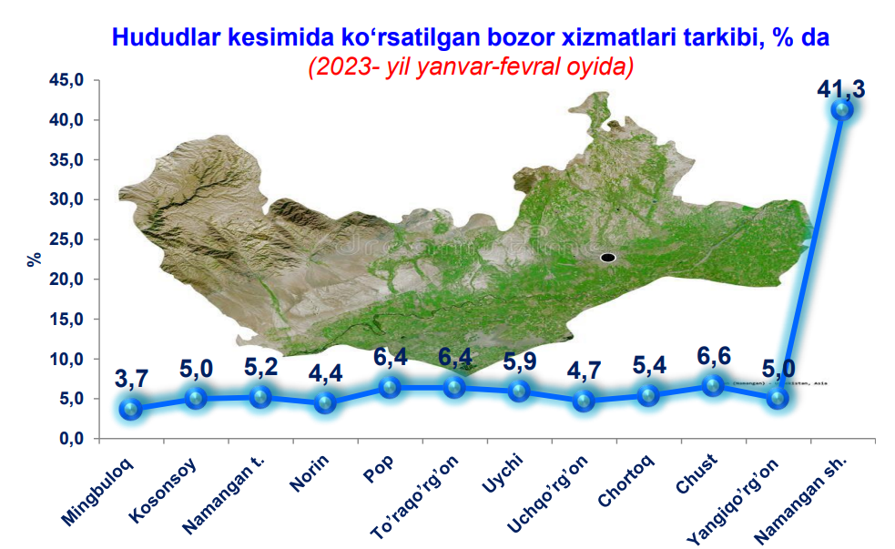 2023- yil yanvar-fevral oyida ko‘rsatilgan bozor xizmatlari umumiy hajmidagi eng katta ulushni Namangan shahri tashkil etdi – 41,3 % (2022- yilning yanvar-fevral oyida – 40,0 %). Xizmat ko‘rsatish sohasining eng past ko‘rsatkichlari Mingbuloq tumanida – 3,7 % (2022- yilning yanvarfevral oyida – 3,8 %) qayd etildi.