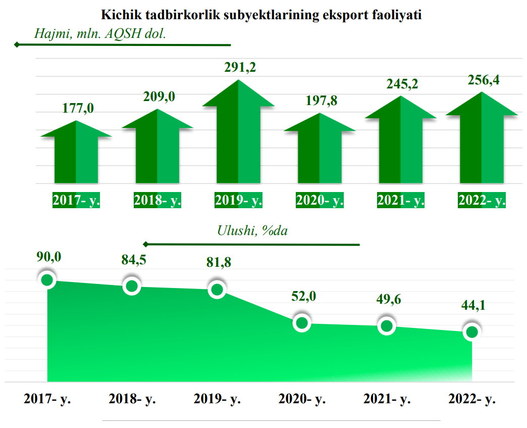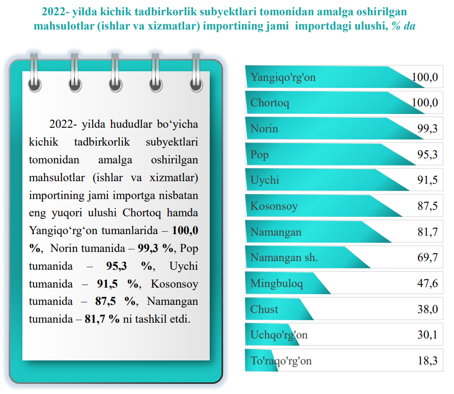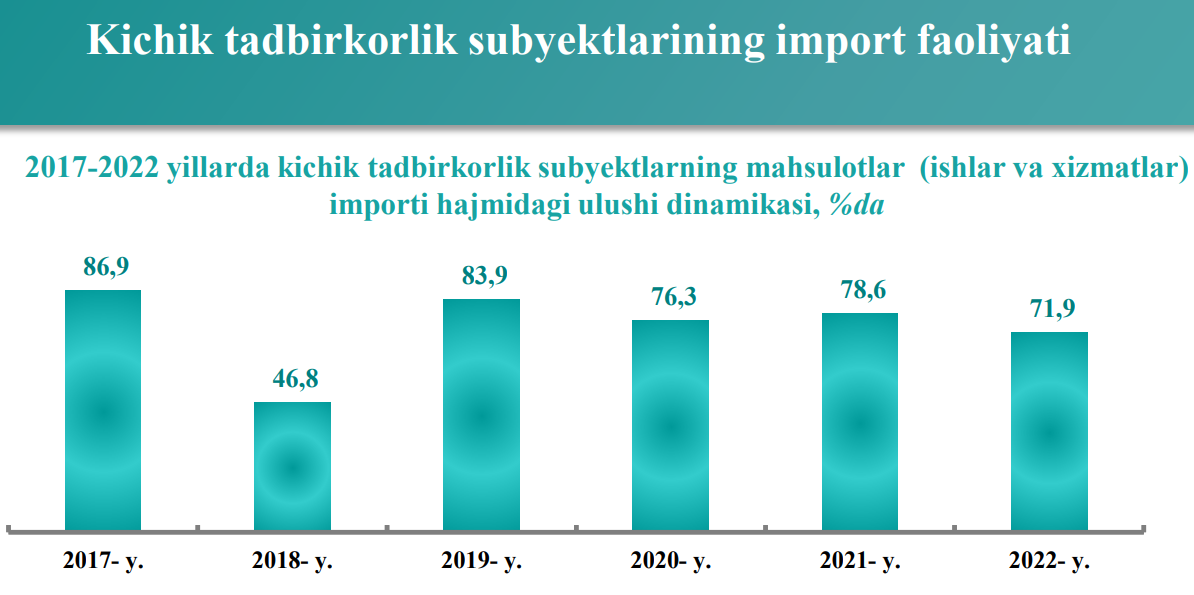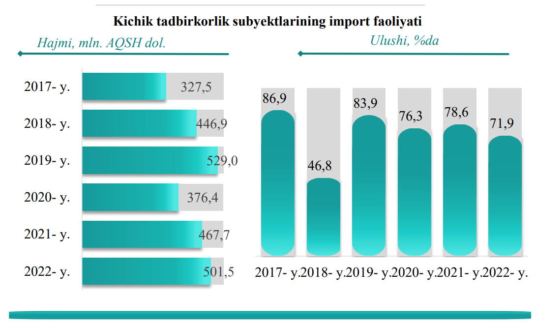 2022- yil yanvar-dekabrida kichik tadbirkorlikda tovar va vaxizmatlar import hajmi 15 154,1 mln. AQSh dollarini tashkil etdi,