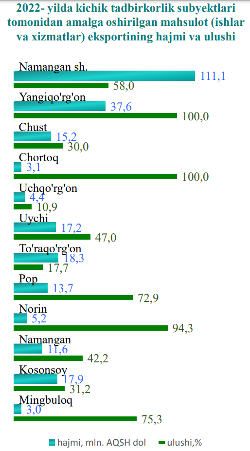 2023- yilning 1- mart holatiga Namangan viloyatida ro'yxatdan o'tgan korxona va tashkilotlarlarning soni 31 181 tani tashkil etmoqda.