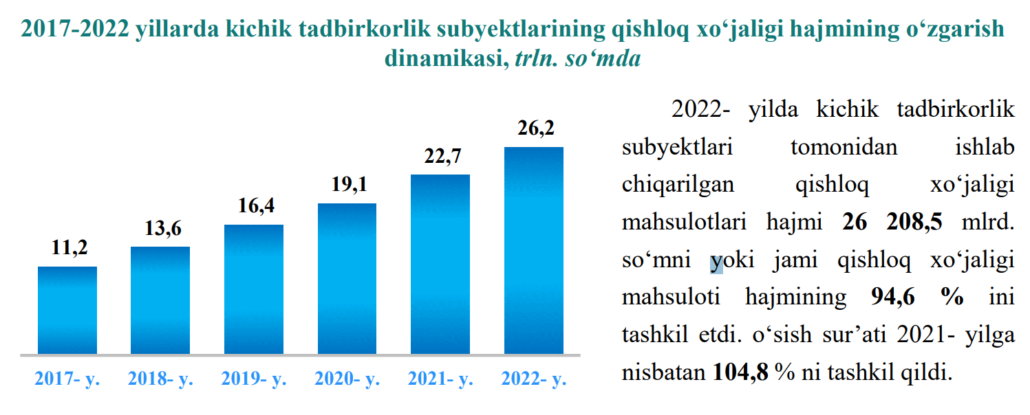 2022- yilning yanvar-dekabr oylarida ishlab chiqarilgan qishloq xo‘jaligi mahsulotlari hajmi 25 117,9 mlrd. so‘mni yoki 2021- yilning mos davriga nisbatan 104,3 % ni,