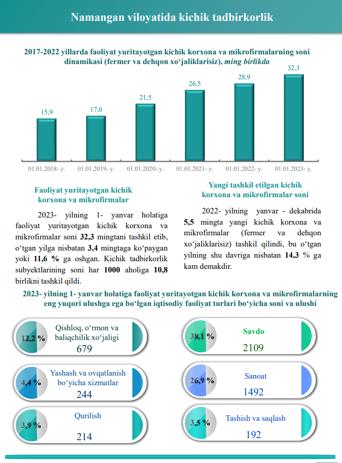 2023-yilning 1-fevral holatiga viloyatimizda jami faoliyat ko‘rsatayotgan korxona va tashkilotlar (fermer va dehqon xo‘jaliklarisiz) soni 35845 tani tashkil etib