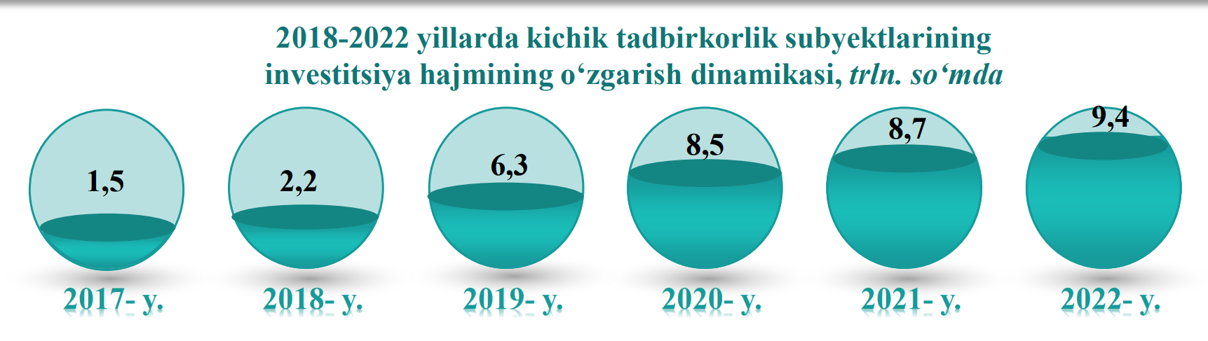 2022- yilning yanvar - dekabrida 5,5 mingta yangi kichik korxona va mikrofirmalar (fermer va dehqon xo‘jaliklarisiz) tashkil qilindi, bu 2021- yilning shu davriga nisbatan 14,3 % ga kam demakdir.