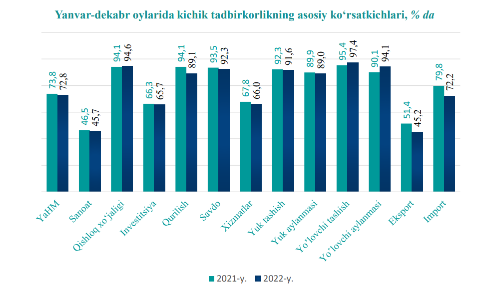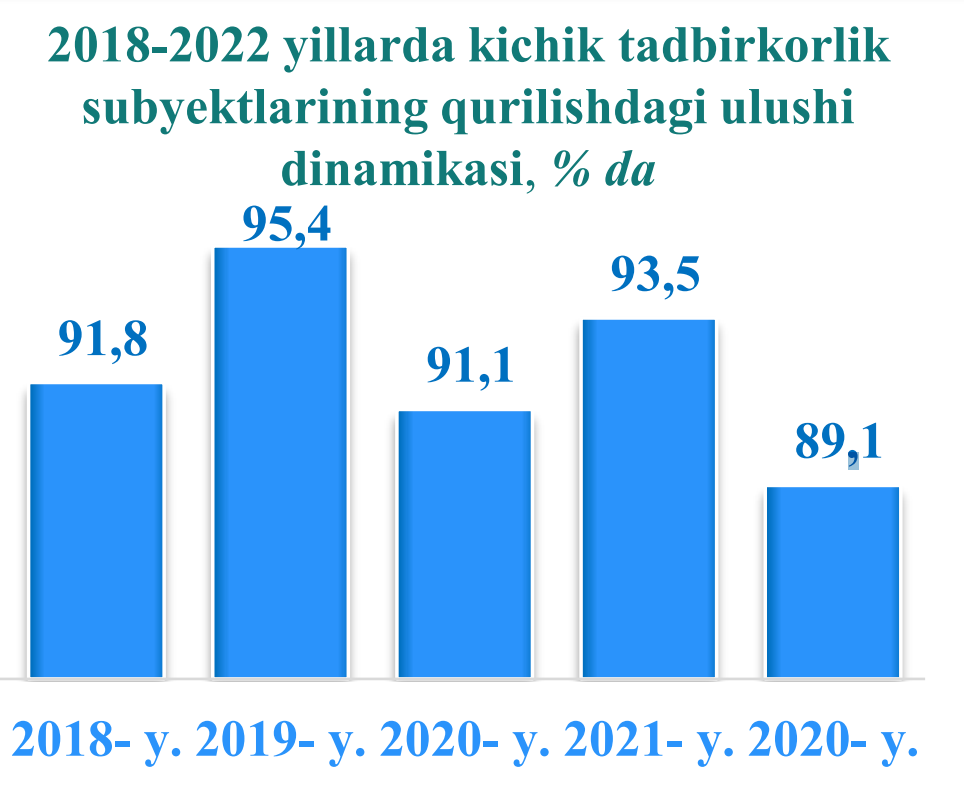 2022- yil yanvar-dekabr oylarida kichik tadbirkorlik subyektlari tomonidan amalga oshirilgan qurilish ishlari hajmi 6 027,3 milliard so‘mni yoki qurilish ishlari umumiy hajmining 89,1 % ini tashkil etdi. o‘sish sur’ati 2021- yil yanvar-dekabr oylariga nisbatan 104,7 % ni tashkil qildi.