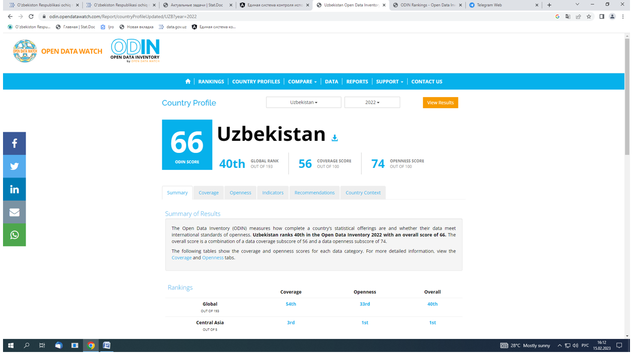 Oʻzbekiston Respublikasi Open Data Inventory (ODIN) ochiq ma’lumotlar reytingida 66 ballni toʻplagan holda mazkur reytingda dunyoda 40-oʻringa ko‘tarildi hamda Markaziy Osiyoda 1-oʻrinni saqlab qoldi.
