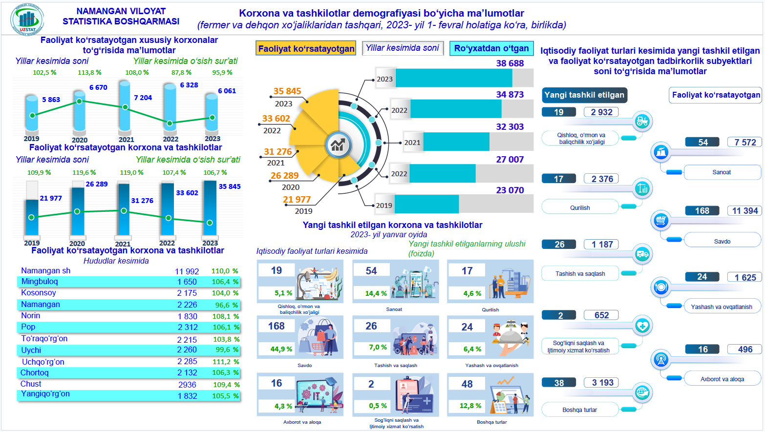 Namangan viloyatida tashkiliy-huquqiy shakli bo‘yicha ro‘yxatdan o‘tgan oilaviy korxonalar soni 2023- yilning 1- fevral holatiga ko‘ra 1 424 tani tashkil etib,