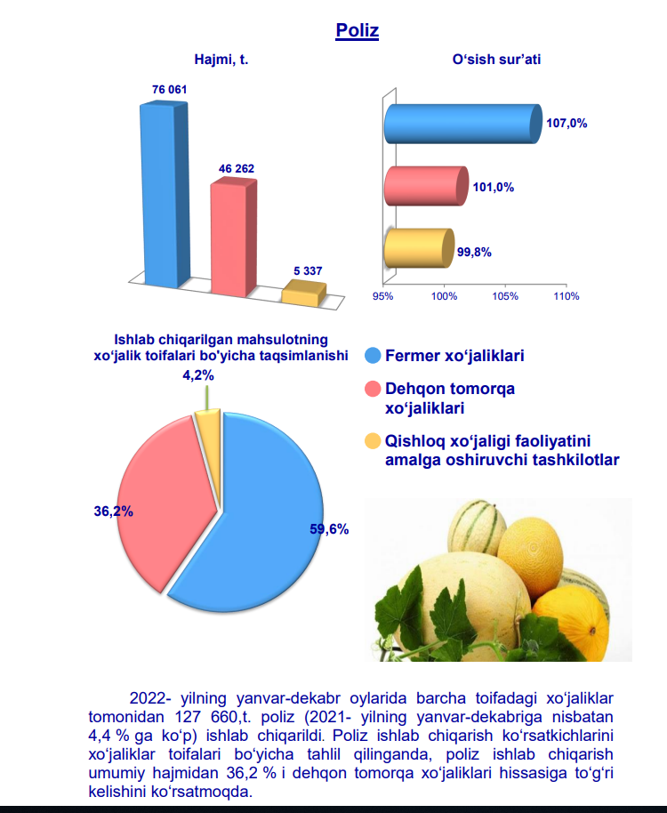 2022- yilning yanvar-dekabr oylarida barcha toifadagi xo‘jaliklar tomonidan 127 660,t. poliz (2021- yilning yanvar-dekabriga nisbatan 4,4 % ga ko‘p) ishlab chiqarildi