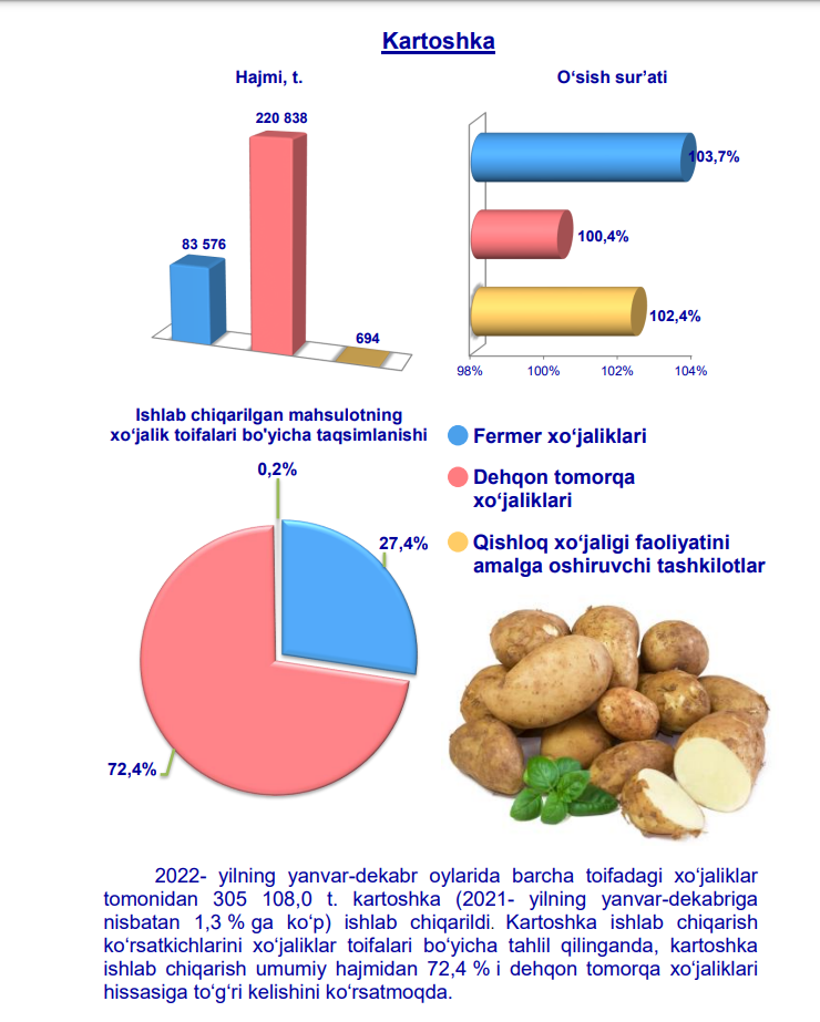 2023-yilning yanvar oyida kartoshka narxlari bir oyda 1,4 % ga oshgan boʻlsa, 2022-yilning yanvariga nisbatan 7,7 % ga arzonlashdi.