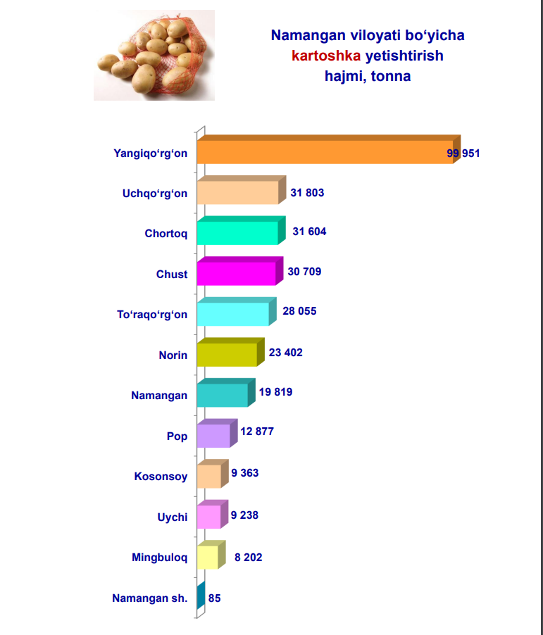 2022- yilning yanvar-dekabr oylarida Yangiqo‘rg‘on tumanida barcha toifadagi xo‘jaliklar tomonidan jami 99 ming 951 tonna kartoshka yetishtirilgan.