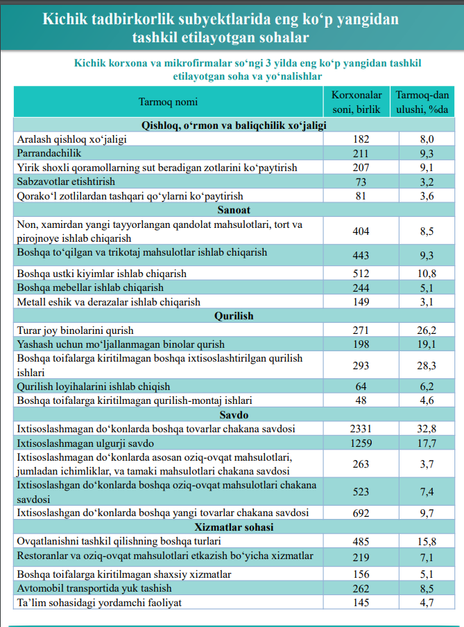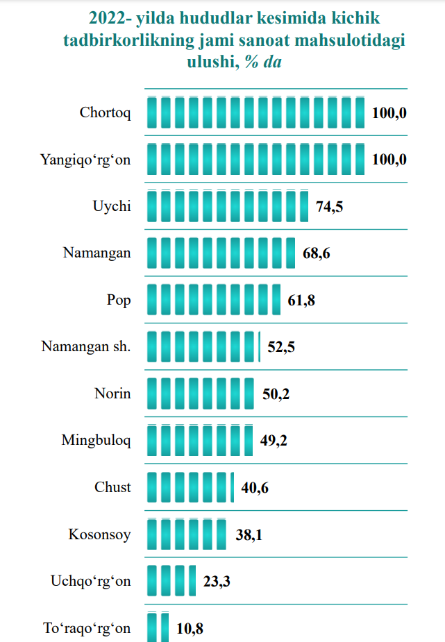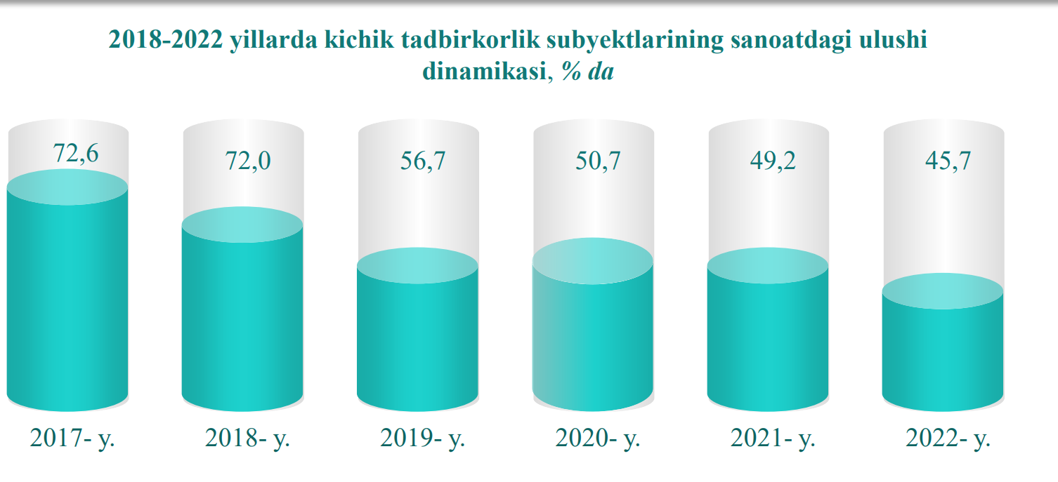 2022- yilda sanoat ishlab chiqarishining umumiy hajmida kichik tadbirkorlikning ulushi 24,2 % ni tashkil etdi.