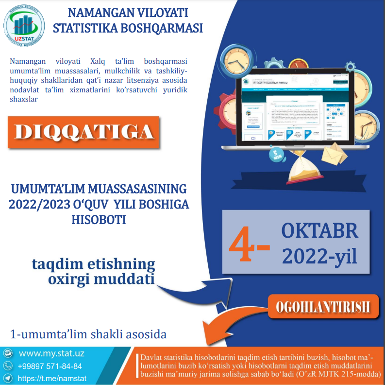 Tumandagi yirik tijorat korxonalarning rahbarlari va bosh hisobchilari diqqatiga 12-moliya shakli oylik “Tashkilotning moliyaviy ahvoli to‘g‘risida” davlat statistika hisobotini har oyning 18-sanasidan kechiktirmay,