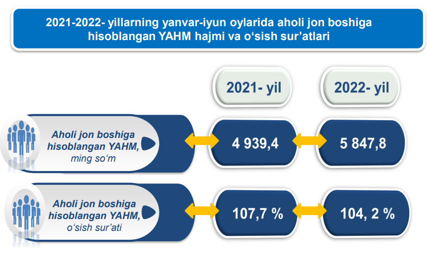 2022-yilning yanvar-iyun oylarida yetishtirilgan chorvachilik mahsulotlarining umumiy hajmi 72,6 trln. soʻmni yoki 2021-yilning mos davriga nisbatan 102,0 % ni tashkil etdi. Yetishtirilgan qishloq xoʻjaligi mahsulotlarining umumiy hajmida chorvachilik mahsulotlarining ulushi 57,3 % ni tashkil qildi.