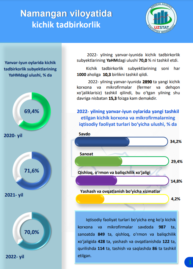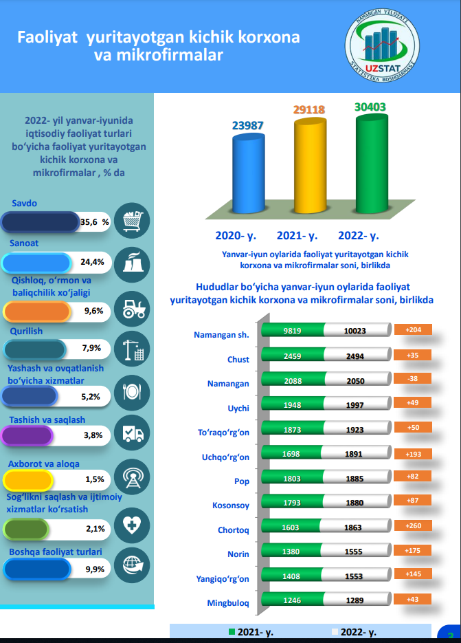 Namangan viloyati bo‘yicha 2022– yilning yanvar-iyun yakunlariga ko‘ra, qishloq, o‘rmon va baliq xo‘jaligi mahsulot (xizmat)lar umumiy hajmining 92,0 % i– dehqonchilik va chorvachilik, ovchilik va ushbu sohalarda ko‘rsatilgan xizmatlar, 7,8 % i– o‘rmon xo‘jaligi, 0,2 % i – baliq xo‘jaligi hissasiga to‘g‘ri keladi.