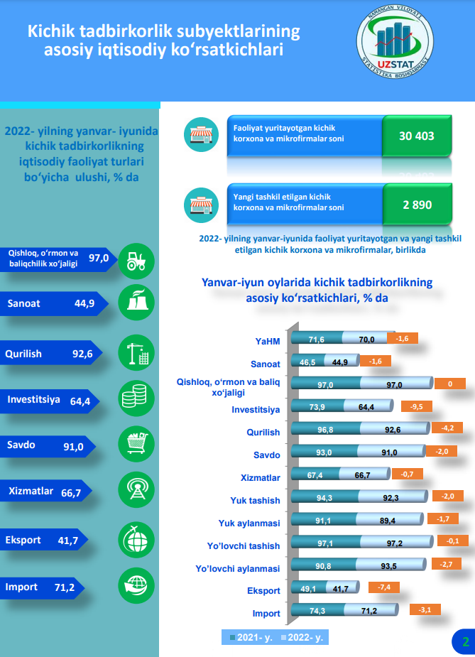 2022- yil 1- iyul holatiga ko‘ra qurilish sohasida korxona va tashkilotlar soni 2402 tani tashkil etib, ular tomonidan 2 trln. 921,5 mlrd. so’mlik qurilish ishlari bajarilgan.