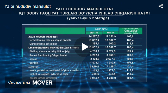 2022- yilning yanvar-iyun oylarida Namangan viloyati bo‘yicha yalpi hududiy mahsulot hajmi 17 trln. 222,9 mlrd. so‘mni tashkil etib, 2021- yilning mos davri bilan taqqoslaganda 6,6 % ga o‘sdi.