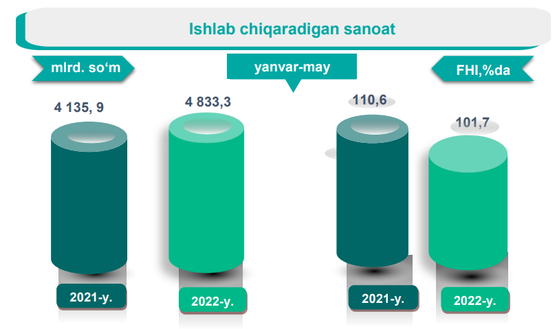 2022-yilning yanvar-may oylarida ishlab chiqaradigan sanoat korxonalari tomonidan ishlab chiqarilgan mahsulotlar hajmi 4 833,3 mlrd. so‘mni yoki jami sanoat mahsulotlarining 81,3 % ini tashkil etdi.