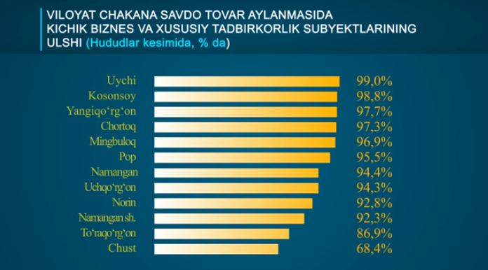 Respublikamizda 2022- yil 1- iyun holatiga ko‘ra faoliyat ko‘rsatayotgan kichik tadbirkorlik subyektlari (fermer va dehqon xo‘jaliklarisiz) soni 487 101 tani tashkil etib, 2018- yilning mos davri bilan solishtirilganda 2,0 barobarga oshgan.