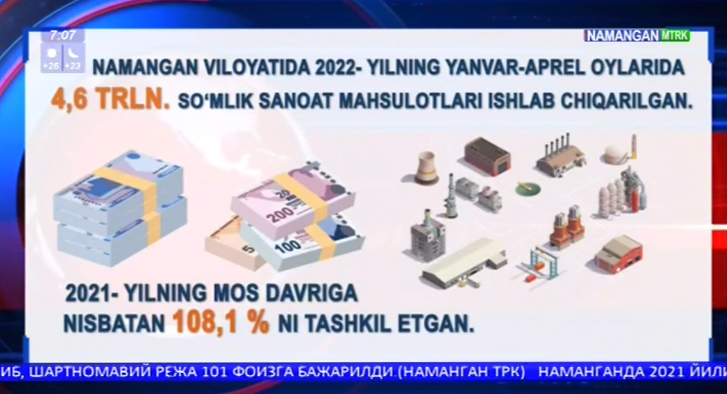 2022- yilning yanvar-may oylarida viloyat korxonalari tomonidan 5 947,0 mlrd. so‘mlik sanoat mahsulotlari ishlab chiqarilgan bo‘lib, 2021- yilning yanvar-may oylariga nisbatan sanoat ishlab chiqarishning fizik hajm indeksi* 108,2 % ni tashkil etdi.