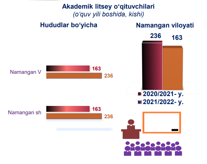 2021- yilda akademik litseylarda dars beradigan o‘qituvchilar soni 2020- yilga nisbatan 73 nafarga yoki 30,9 foizga kamaydi va 163 nafarni tashkil etdi.