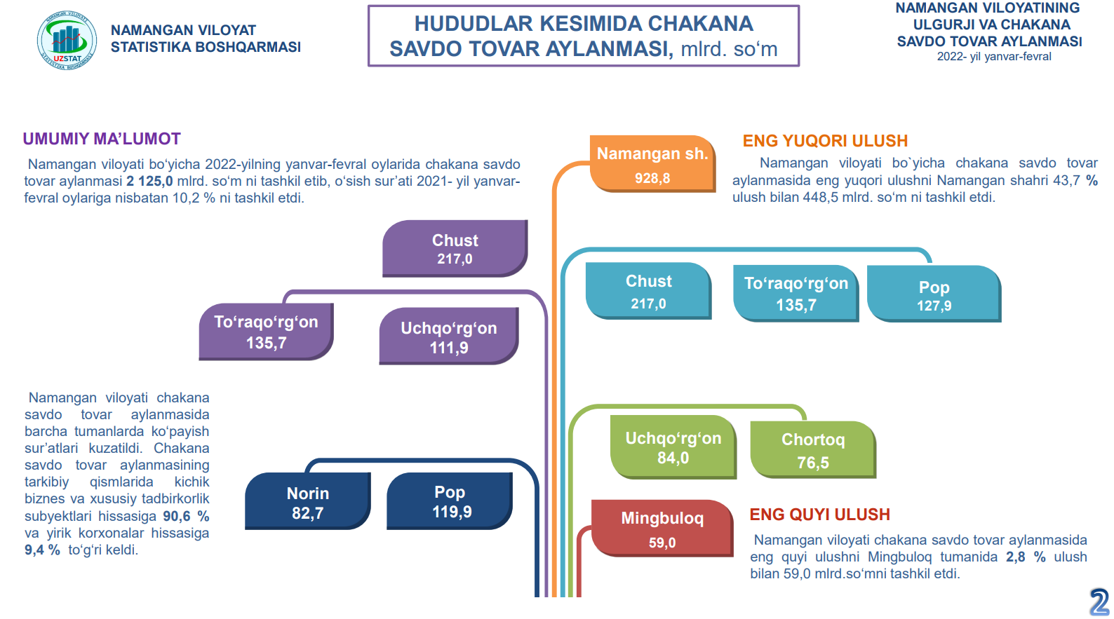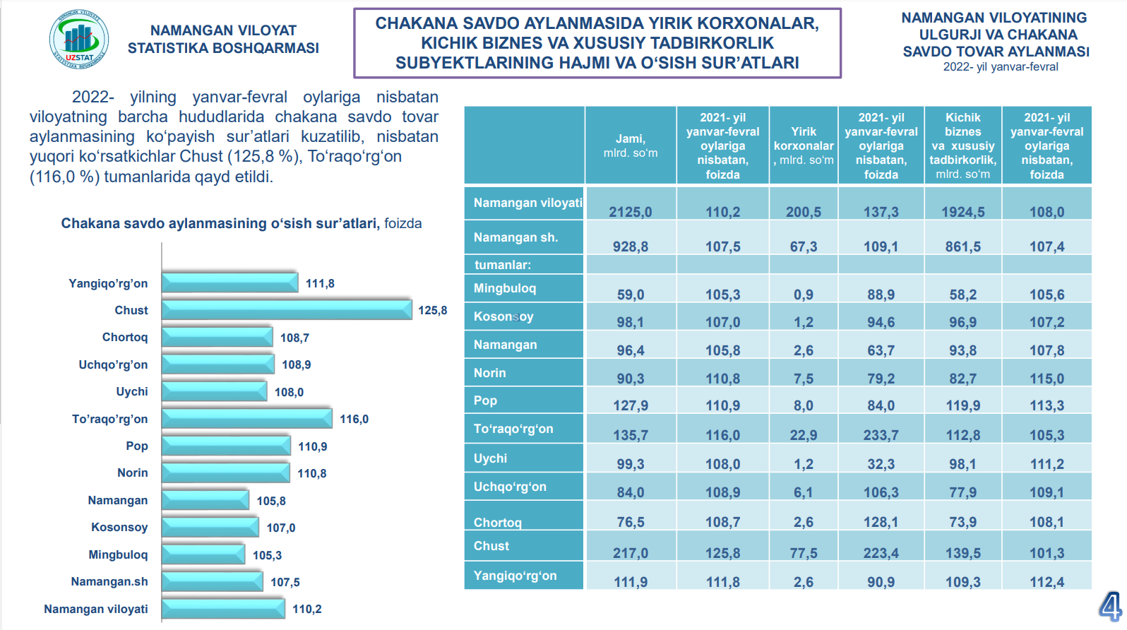 2022- yilning 1-may holatiga viloyat bo‘yicha faoliyat yuritayotgan korxonlarning 2 762 tasi (faoliyat ko‘rsatayotgan korxonalar umumiy sonining 37,9 % i) Namangan shahriga,
