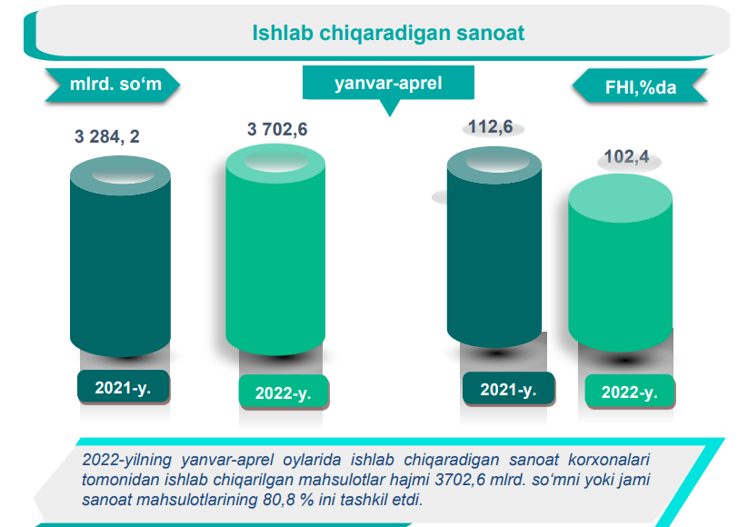2022-yilning yanvar-aprel oylarida ishlab chiqaradigan sanoat korxonalari tomonidan ishlab chiqarilgan mahsulotlar hajmi 3702,6 mlrd. so‘mni yoki jami sanoat mahsulotlarining 80,8 % ini tashkil etdi.