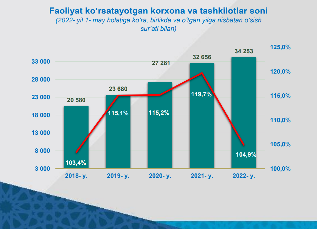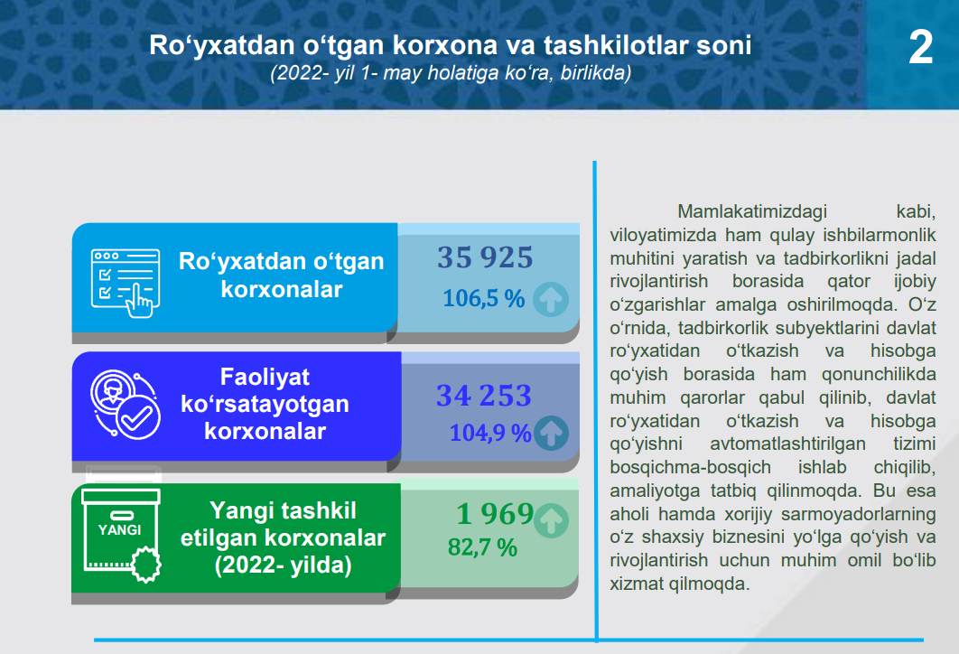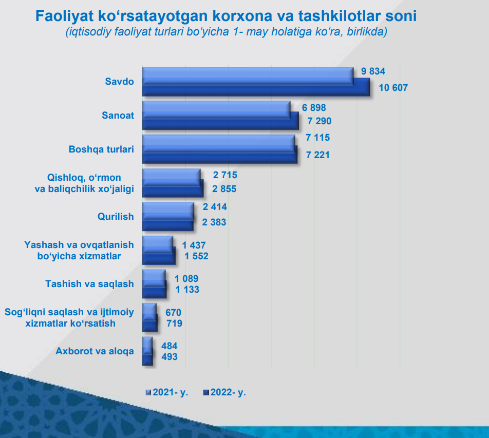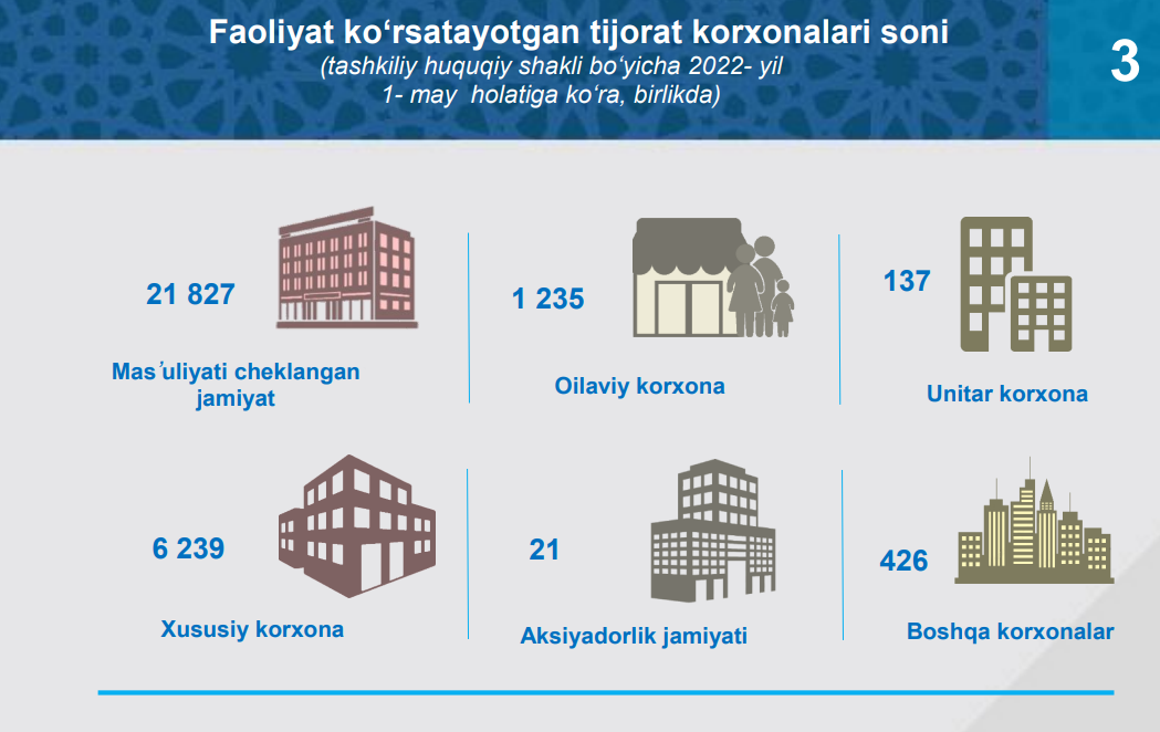 Respublikamizda tashkiliy- huquqiy shakli bo‘yicha faoliyat ko‘rsatayotgan korxonalar soni ko‘pligi bo‘yicha hisoblanganda 3- o‘rinni oilaviy korxonalar egallagan bo‘lib, ular 2022- yil 1- may holatiga ko‘ra jami tadbirkorlik subyektlarining 11,3 foiz ulushini tashkil etgan.