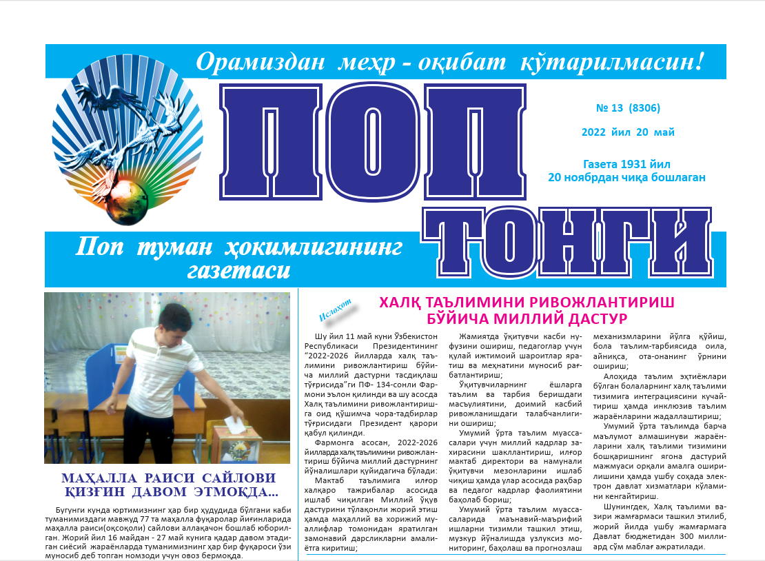 ?"Pop tongi" gazetasining 2022- yilning 20- may kungi 13- sonida Pop tuman statistika bo‘limi tomonidan Aholini ro‘yxatga olish tartiblari nomli maqola chop etildi.