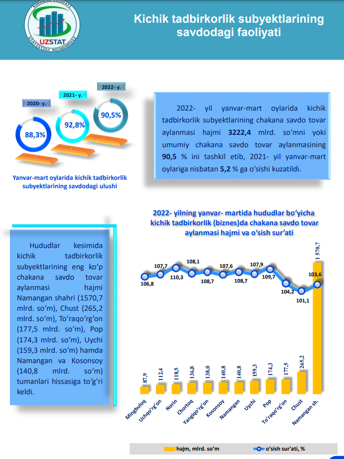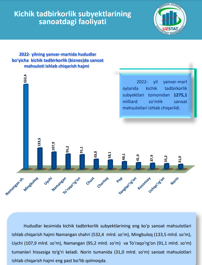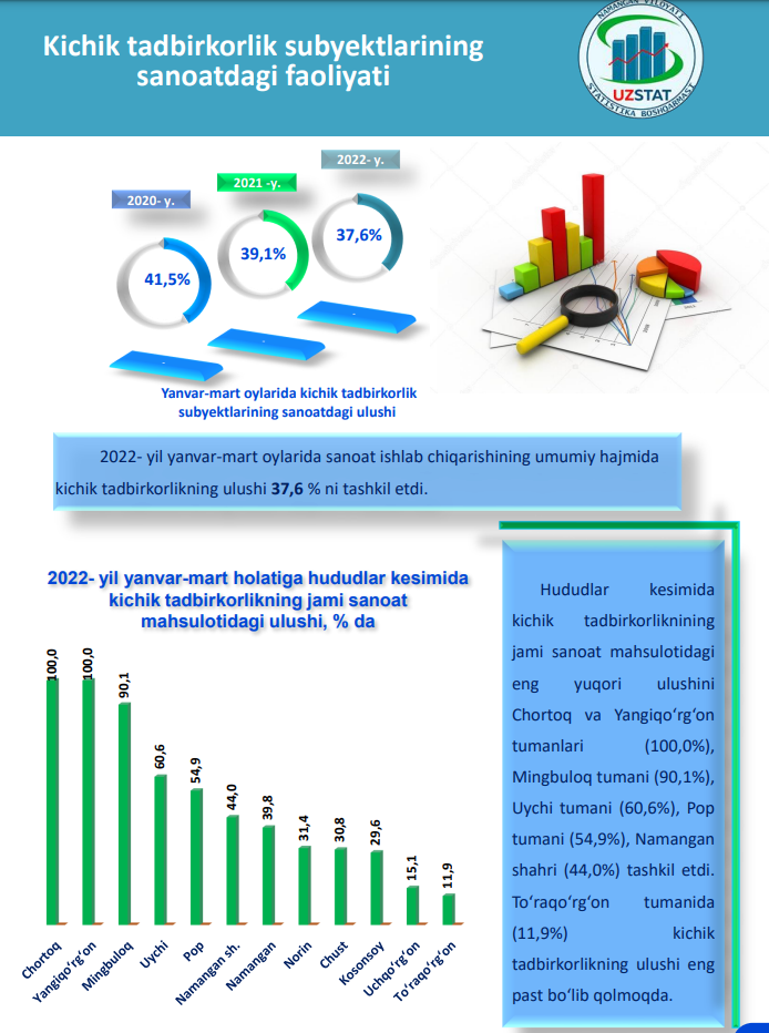 2022- yil yanvar-mart oylarida sanoat ishlab chiqarishining umumiy hajmida kichik tadbirkorlikning ulushi 37,6 % ni tashkil etdi.