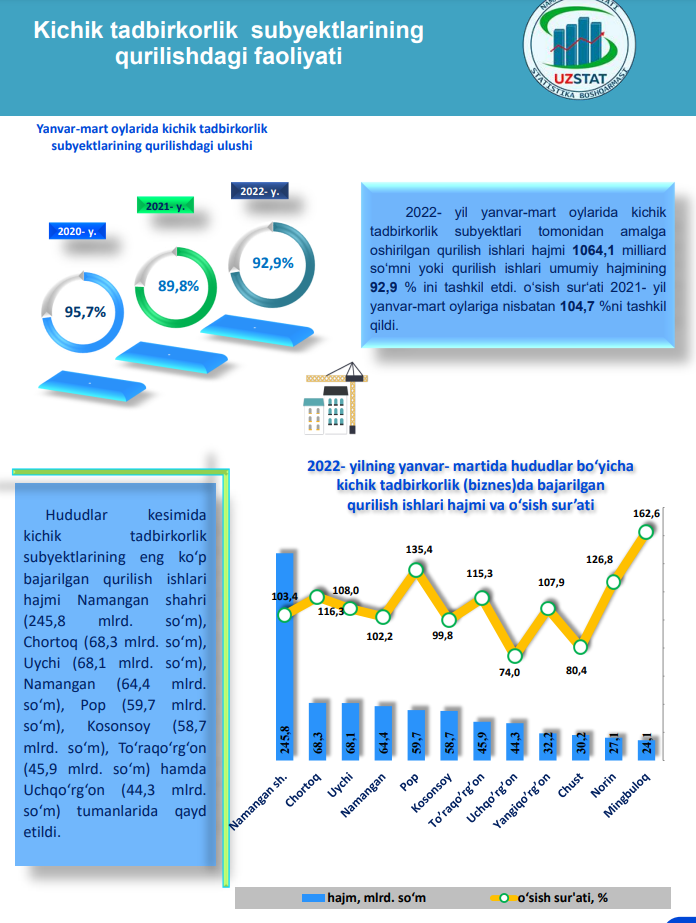Joriy yilning yanvar-aprel oylarida Namanagan viloyatida jami 1634,6 mlrd. so‘mlik qurilish ishlari bajarilib, o‘sish sur’ati 2021- yilning mos davriga nisbatan 107,1 % ni tashkil etdi.