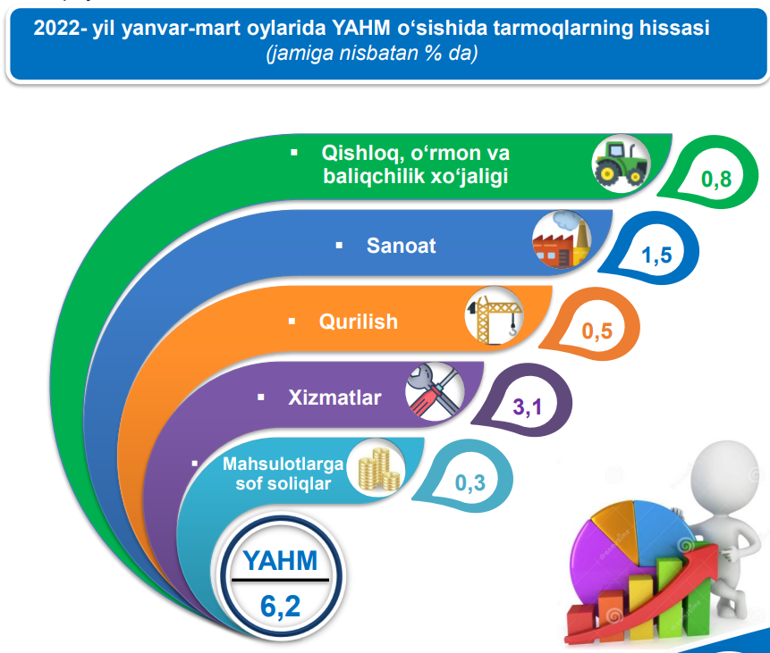 2022– yilning yanvar– mart oylarida qishloq, o‘rmon va baliqchilik xo‘jaligi mahsulot (xizmat)larining umumiy hajmi 2 trln. 138,6 mlrd. so‘mni tashkil etdi. O‘sish sur'ati 2021– yilning mos davriga nisbatan 104,0 % ni tashkil etgan.