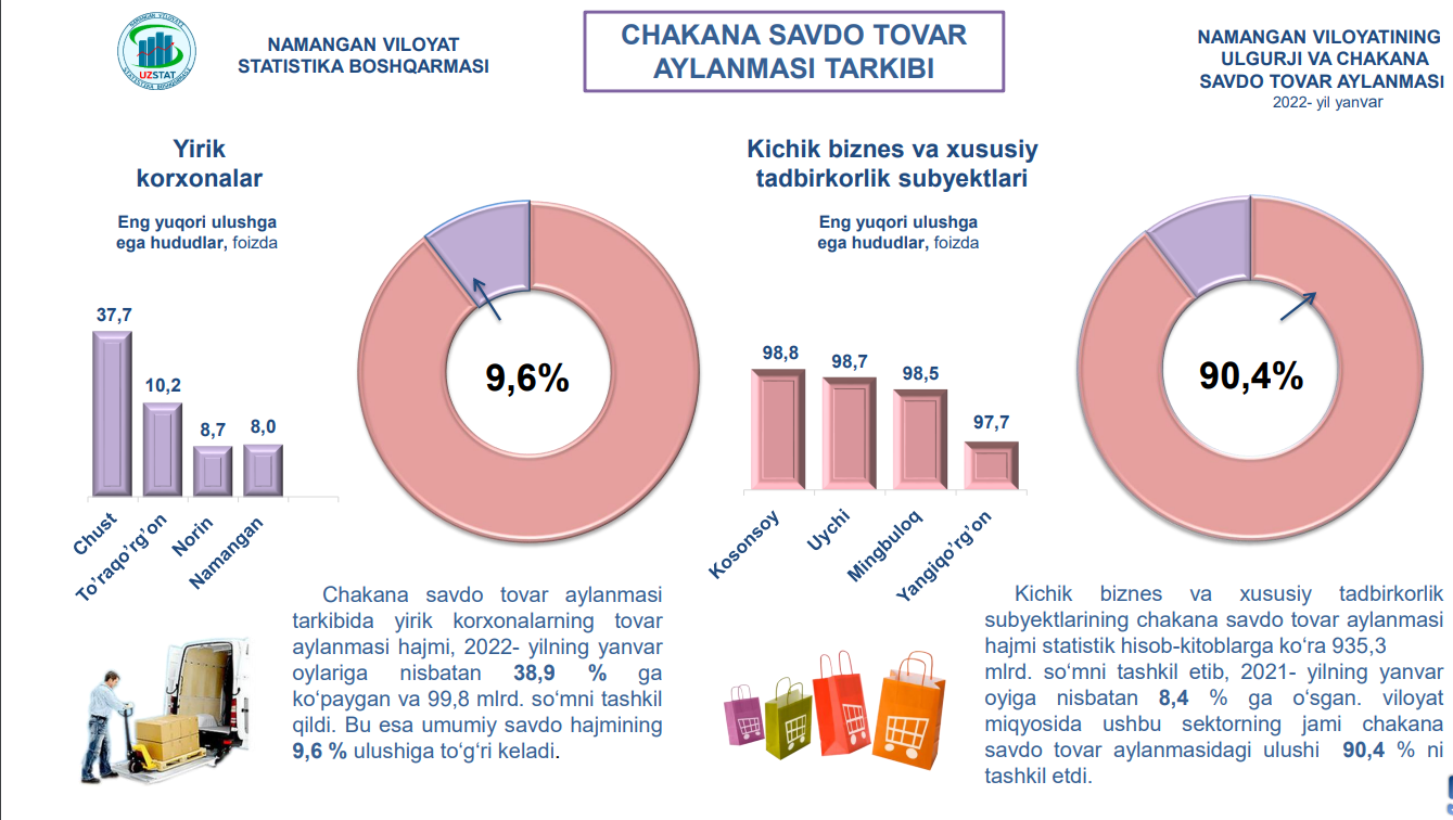 Chakana savdo tovar aylanmasi tarkibida yirik korxonalarning tovar aylanmasi hajmi, 2022- yilning yanvar oylariga nisbatan 38,9 % ga ko‘рaygan va 99,8 mlrd. so‘mni tashkil qildi.