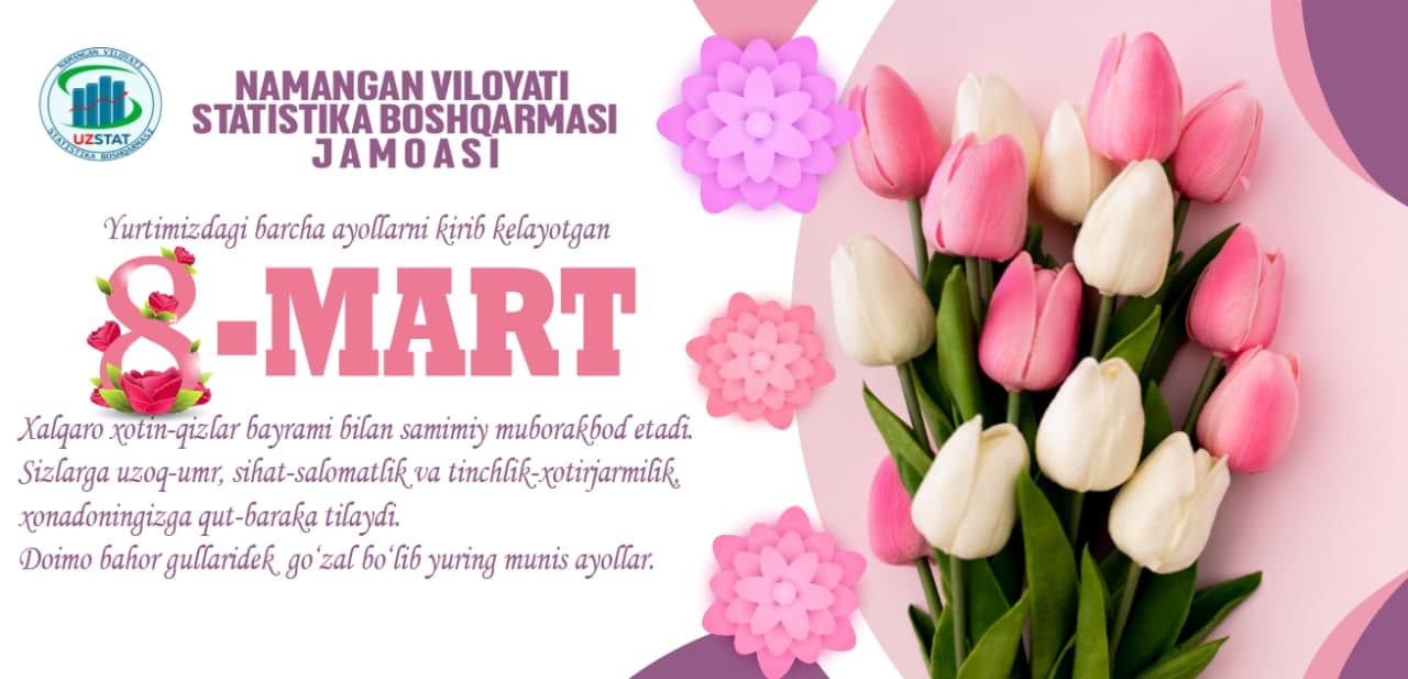 8- mart - Xalqaro xotin-qizlar kuni munosabati bilan Namangan viloyati statistika boshqarmasida tadbir tashkil etildi. Unga boshqarma va shahar, tuman statistika bo‘limlarida faoliyat yuritayotgan xotin-qizlar taklif etildi.