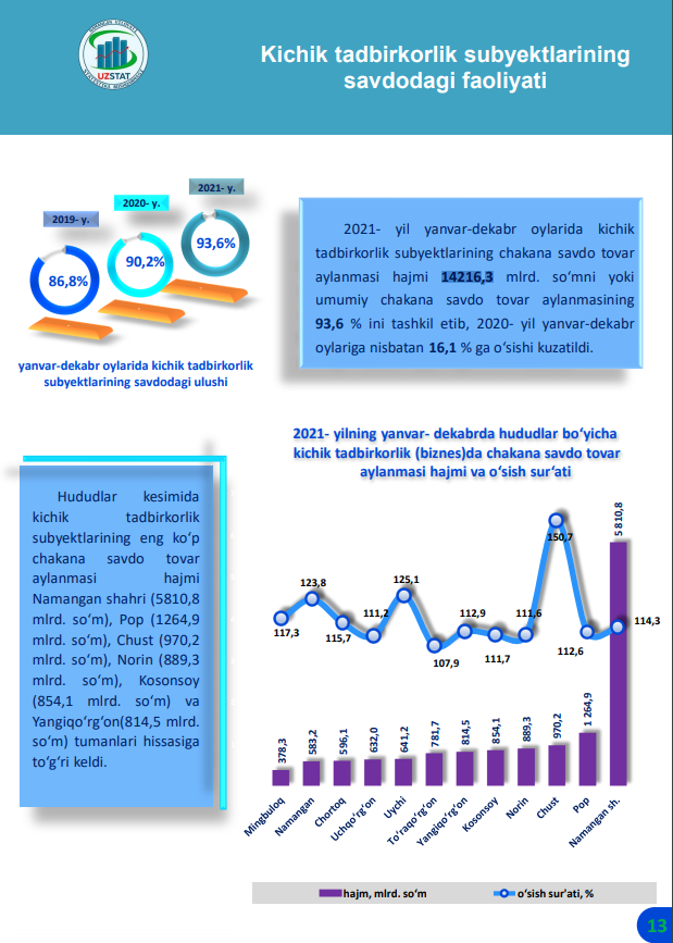 Namangan viloyati bo‘yicha 2022- yilning yanvar oyida chakana savdo tovar 1 035,1 mlrd. so‘mni tashkil etib, 2021- yil yanvar-fevral oylariga nisbatan 10,8 % ga o‘sgan.