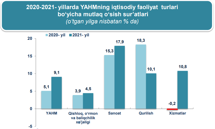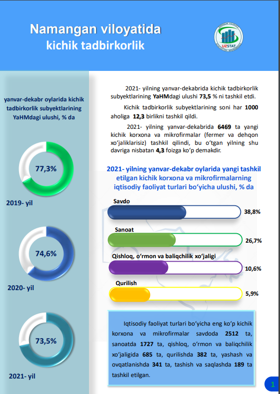 2021- yilning yanvar-dekabrida kichik tadbirkorlik subyektlarining YaHMdagi ulushi 73,5 % ni tashkil etdi.