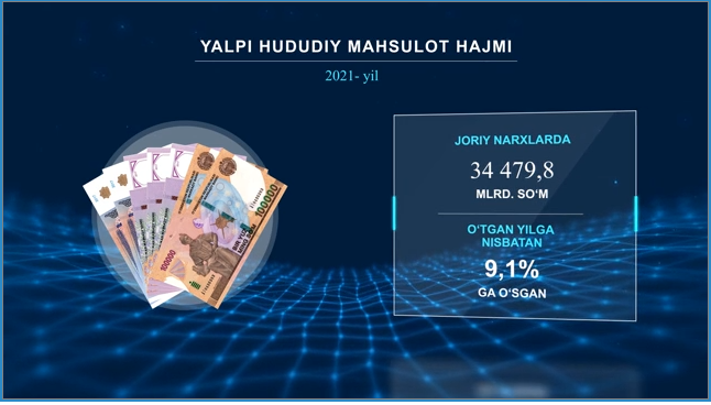 2021- yilning yanvar–dekabrida Namangan viloyati bo‘yicha yalpi hududiy mahsulot (keyingi o‘rinlarda – YAHM) hajmi joriy narxlarda 34 479,8 mlrd. so‘mni tashkil etdi va 2020- yilning mos davri bilan taqqoslaganda 9,1 % ga o‘sdi.