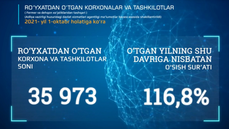 2021- yilning yanvar-sentabr oylarida, Namangan viloyatida ro'yxatdan o'tgan korxona va tashkilotlarlarning soni 35 973 tani tashkil etmoqda. Bu koʼrsatkich oʼtgan yilning shu davriga nisbatan 116,8 % ga oshgan.
