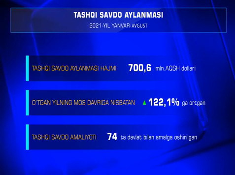 2021- yil yanvar-avgust oyi yakuni bo’yicha Namangan viloyati tomonidan 62 davlat bilan tovarlar va xizmatlar importi amalga oshirildi.