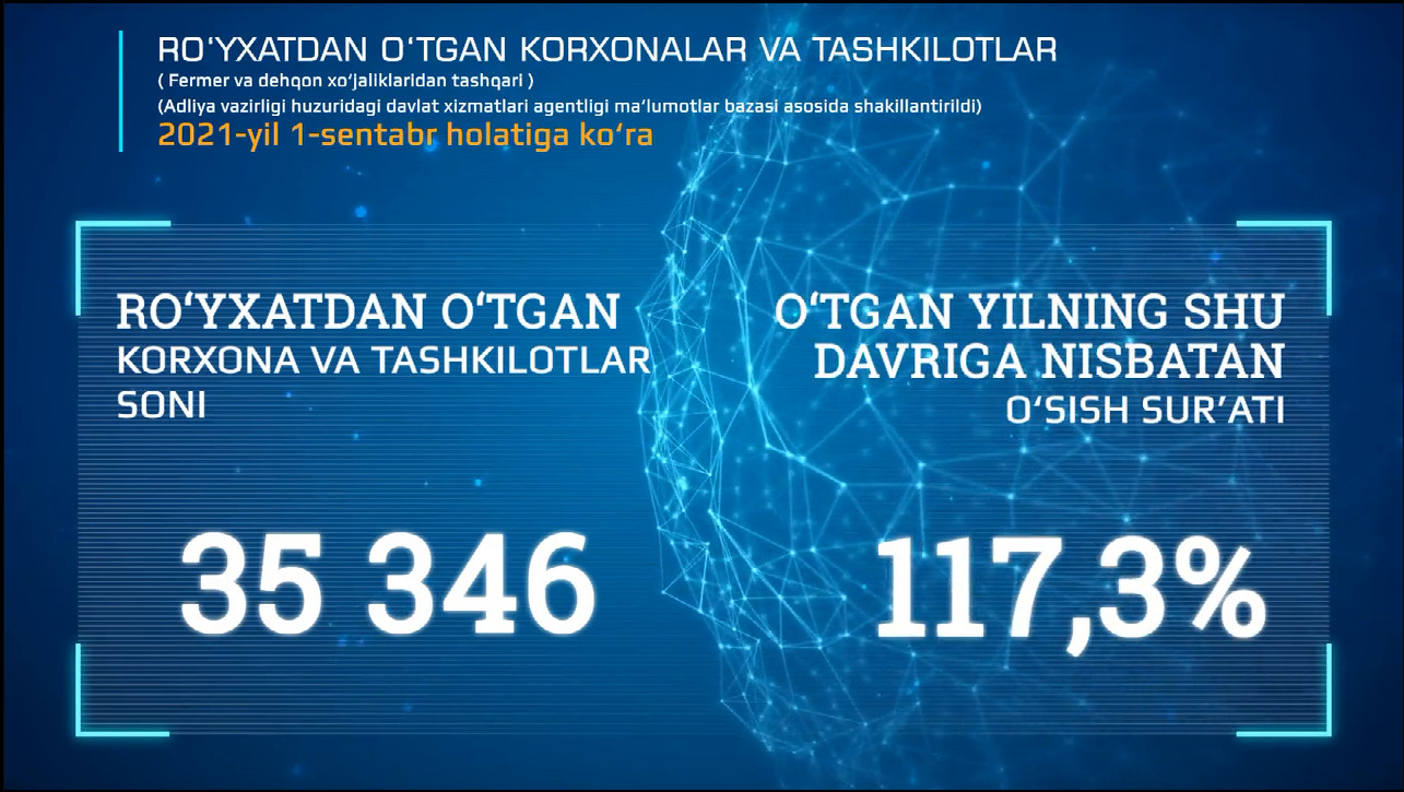 021- yilning yanvar-avgust oylarida, Namangan viloyatida ro'yxatdan o'tgan korxona va tashkilotlarlarning soni 35 346 tani tashkil etmoqda. Bu koʼrsatkich oʼtgan yilning shu davriga nisbatan 117,3 % ga oshgan.