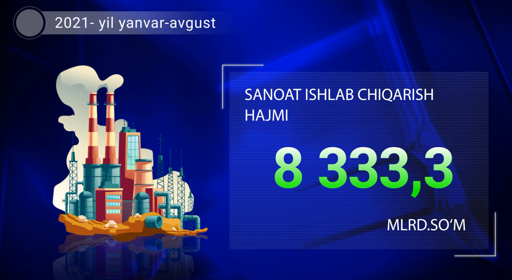 Dastlabki ma’lumotlar bo‘yicha 2021- yilning yanvar-avgust oylarida viloyat korxonalari tomonidan 8333,3 mlrd. so‘mlik sanoat mahsulotlari ishlab chiqarilgan bo‘lib, 2020- yilning yanvar-avgust oylariga nisbatan sanoat ishlab chiqarishning fizik hajm indeksi* 114,9 % ni tashkil etdi.