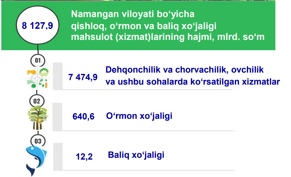 Namangan viloyati bo‘yicha 2021– yilning yanvar– iyun oylarida barcha toifadagi xo‘jaliklar tomonidan 66 201 t. meva va rezevor mahsulotlari yetishtirilgan. Bu ko‘rsatkich 2020– yilning yanvar– iyun oylariga nisbatan 0,5 % ga ko‘paygan.