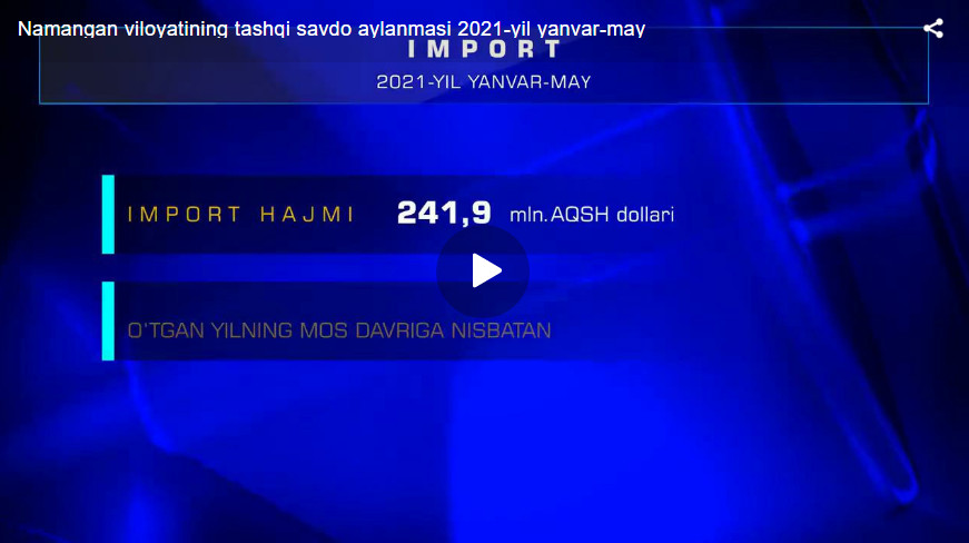 Namangan viloyatida 2021-yil yanvar-may oylarida import hajmi 241,9 mln.AQSh dollarini tashkil etib, 2020- yilning mos davriga nisbatan 136,5 % ga o‘sdi.