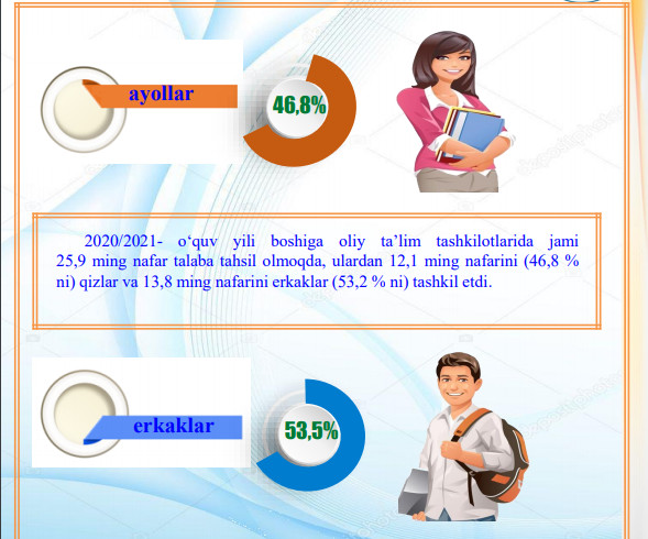 Namangan viloyatida 2020/2021- o‘quv yili boshiga oliy ta’lim tashkilotlarida jami 25,9 ming nafar talaba tahsil olmoqda, ulardan 12,1 ming nafarini (46,8 % ni) qizlar va 13,8 ming nafarini erkaklar