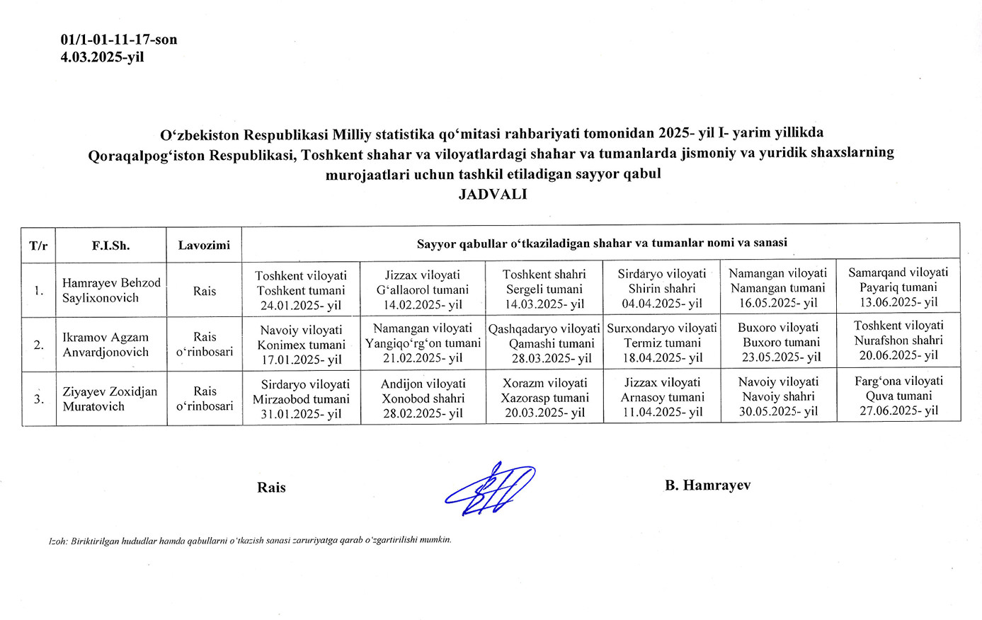 O’zbekiston Respublikasi Milliy statistika qo‘mitasi rahbariyati tomonidan 2025- yil II- yarim yillikda Qoraqalpog‘iston Respublikasi, Toshkent shahar va viloyatlardagi shahar va tumanlarda