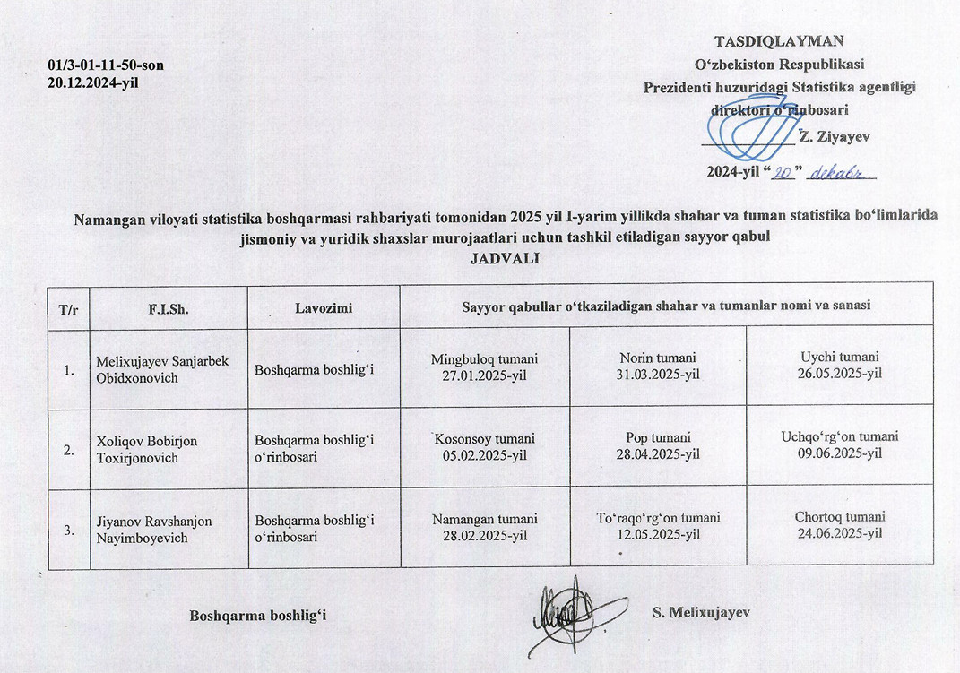 Namangan viloyati statistika boshqarmasi rahbariyati tomonidan 2025- yil II-yarim yillikda