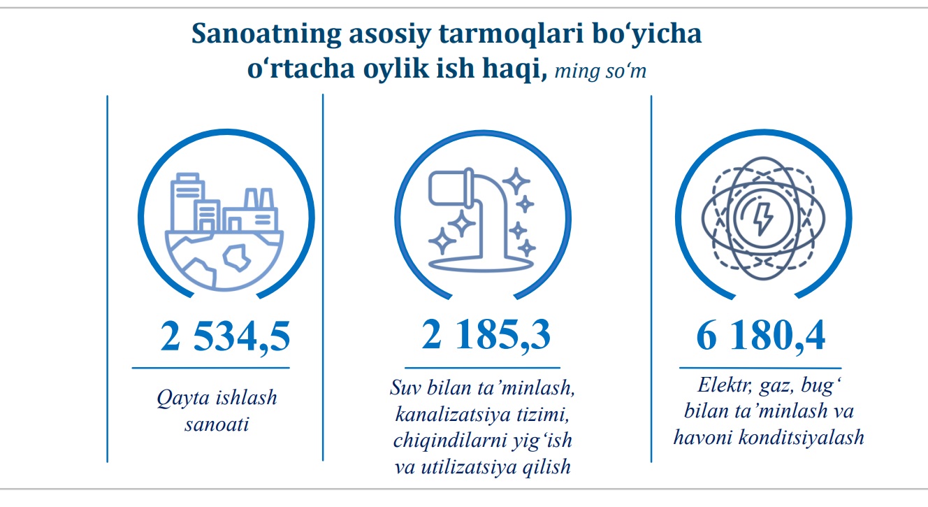 2023- yilning yanvar-mart oylarida Namangan viloyatida sanoatning asosiy tarmoqlari bo‘yicha o‘rtacha oylik ish haqining eng yuqori ko‘rsatkichi elektr, gaz, bug‘ bilan ta’minlash va havoni konditsiyalash (6 180,4 ming so‘m) da kuzatildi.