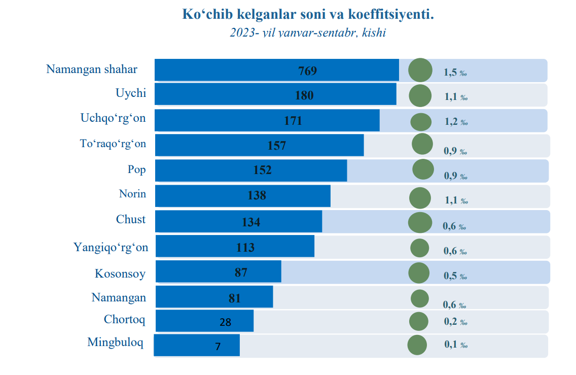 2023- yilning yanvar-sentabr oylarida Namangan viloyatiga 2,0 mingta ko‘chib kelganlar qayd etilgan bo‘lib, har 1000 aholiga ko‘chib kelish koeffitsiyenti 0,9 promilleni tashkil etgan.