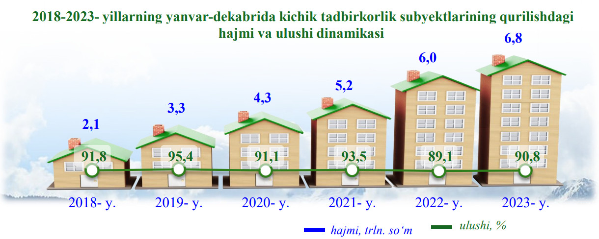 2023- yil yanvar-dekabr oylarida kichik tadbirkorlik subyektlari tomonidan amalga oshirilgan qurilish ishlari hajmi 6 845,1 mlrd. so‘mni yoki qurilish ishlari umumiy hajmining 91,7 % ini tashkil etdi. O‘sish sur‘ati 2022- yil yanvardekabr oylariga nisbatan 110,3 % ni tashkil qildi.