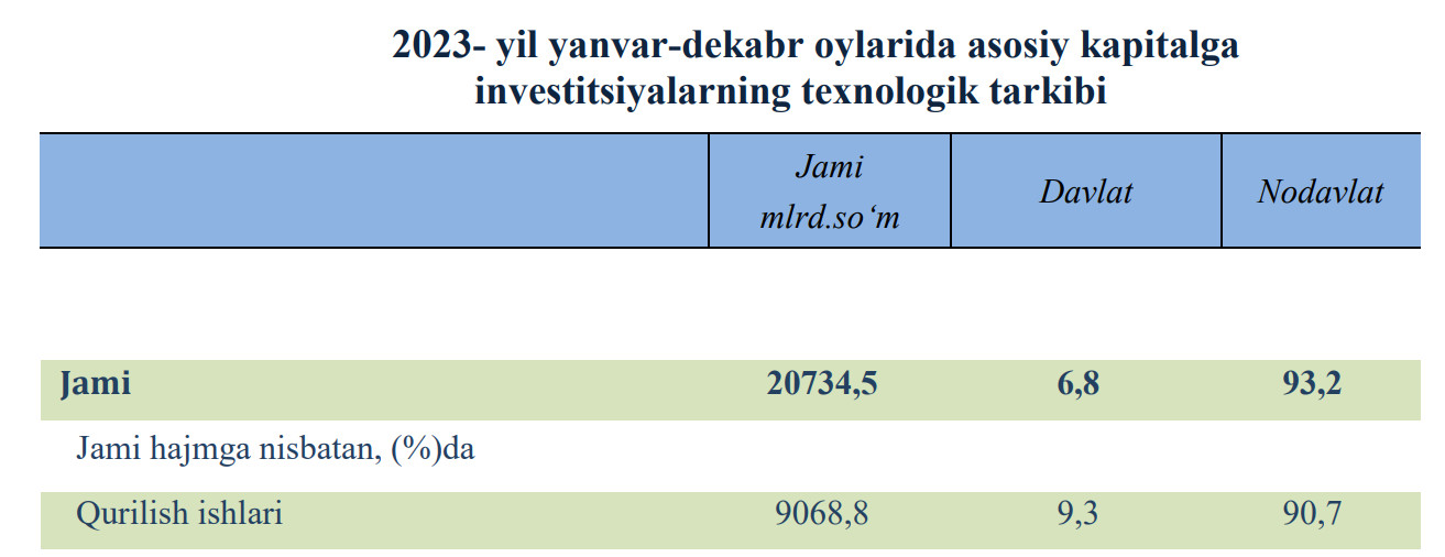Shundan, 47,3 %ini yoki 9068,8 mlrd. so‘mini qurilish-montaj ishlari tashkil etgan. Qurilish ishlariga kiritilgan investitsiyarlaning 9,3 %i davlat va 90,7 %i nodavlat tashkilotlari hissasiga to'g'ri kelgan.
