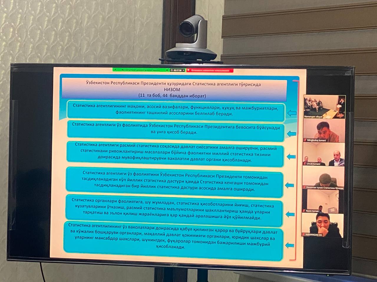2024- yil 25- mart kuni Namangan viloyat statistika boshqarmasi hamda hududiy statistika bo‘limlari xodimlari ishtirokida O‘zbekiston Respublikasi Prezidentining 04.03.2024- yildagi “O‘zbekiston Respublikasi Prezidenti huzuridagi Statistika agentligi faoliyatini tashkil etish chora-tadbirlari to‘g‘risida” PQ-114-son qarori hamda ushbu qaror bilan tasdiqlangan O‘zbekiston Respublikasi Prezidenti huzuridagi Statistika agentligi to‘g‘risidagi nizomni o‘rganish bo‘yicha seminar o‘tkazildi.